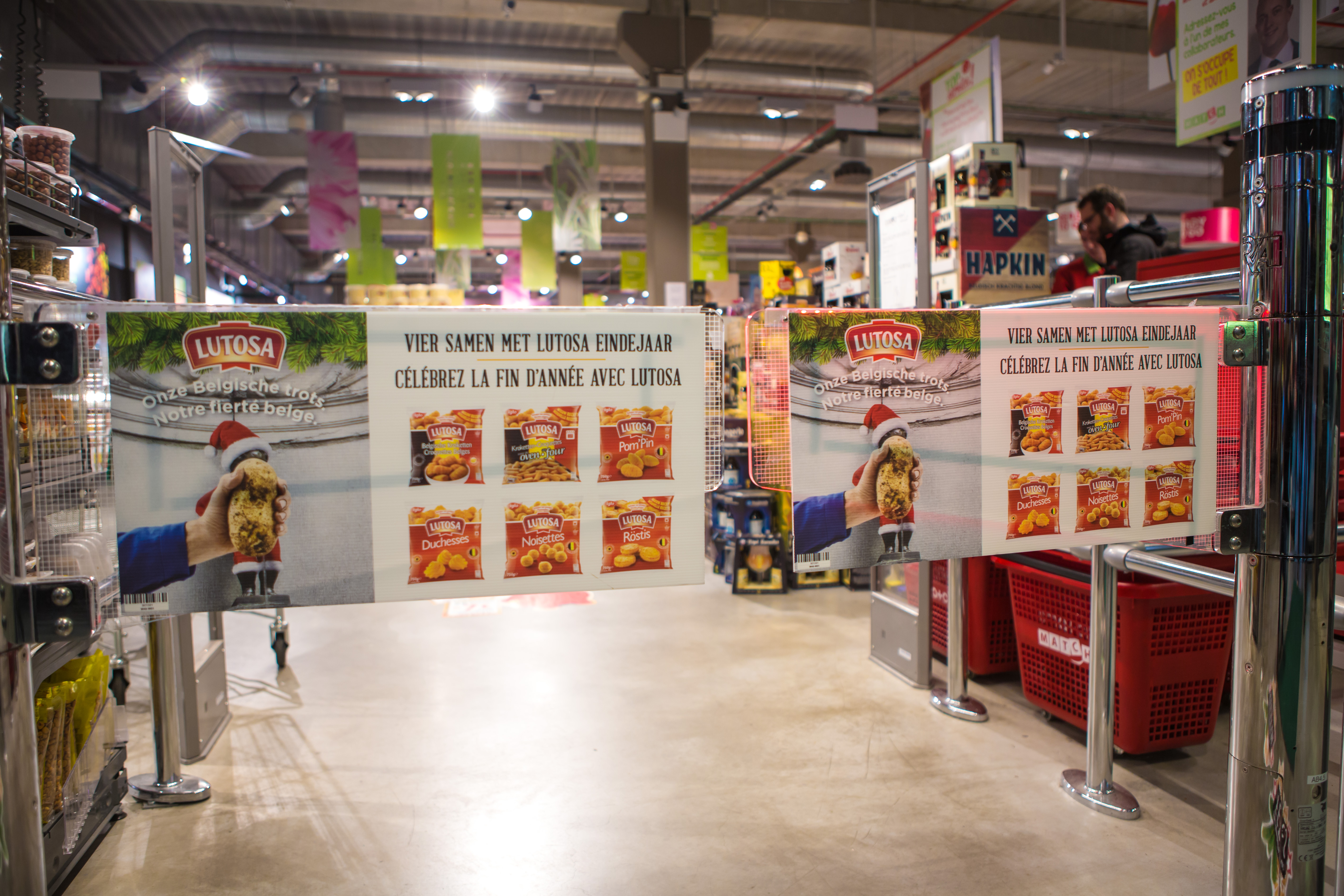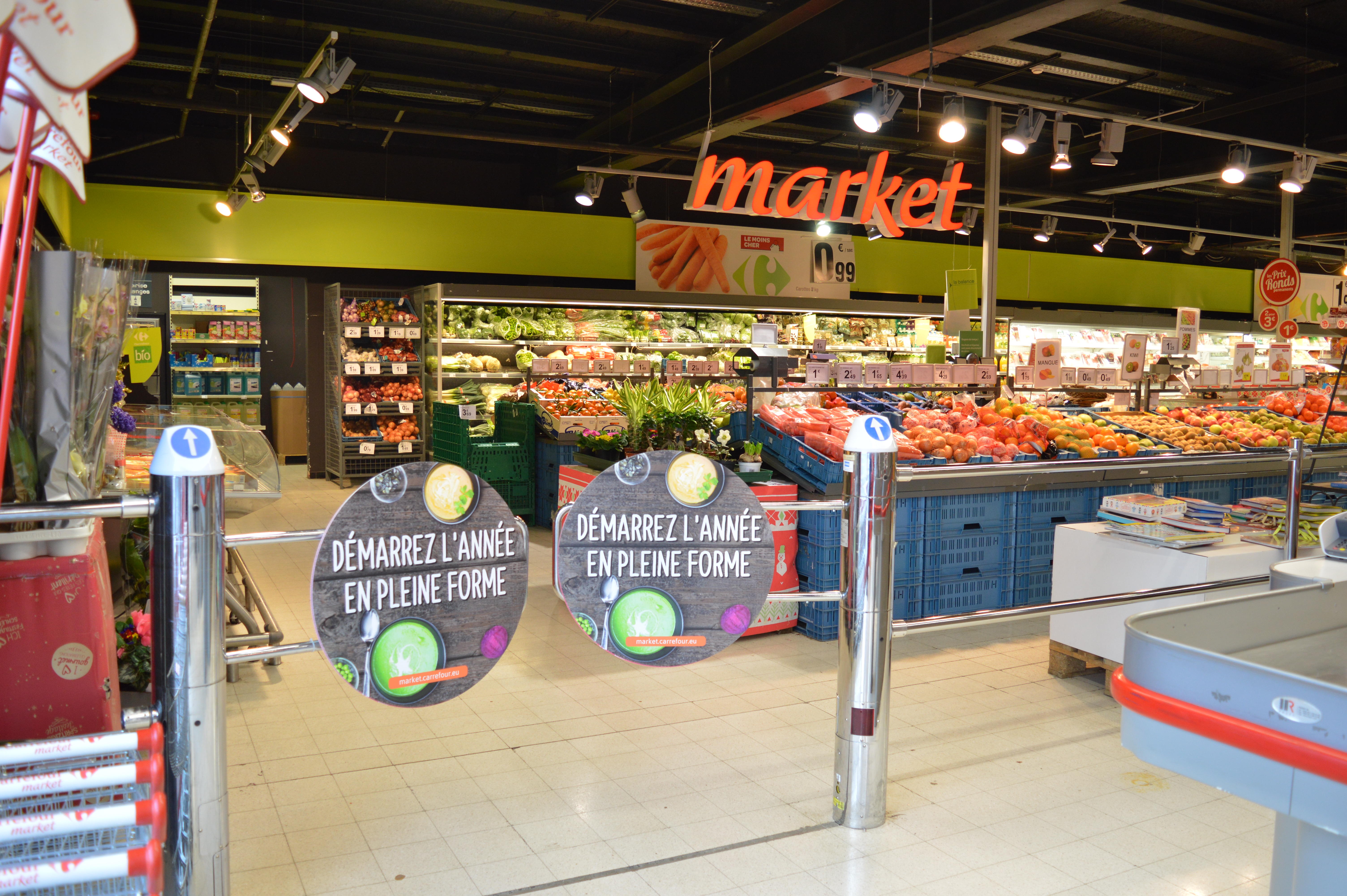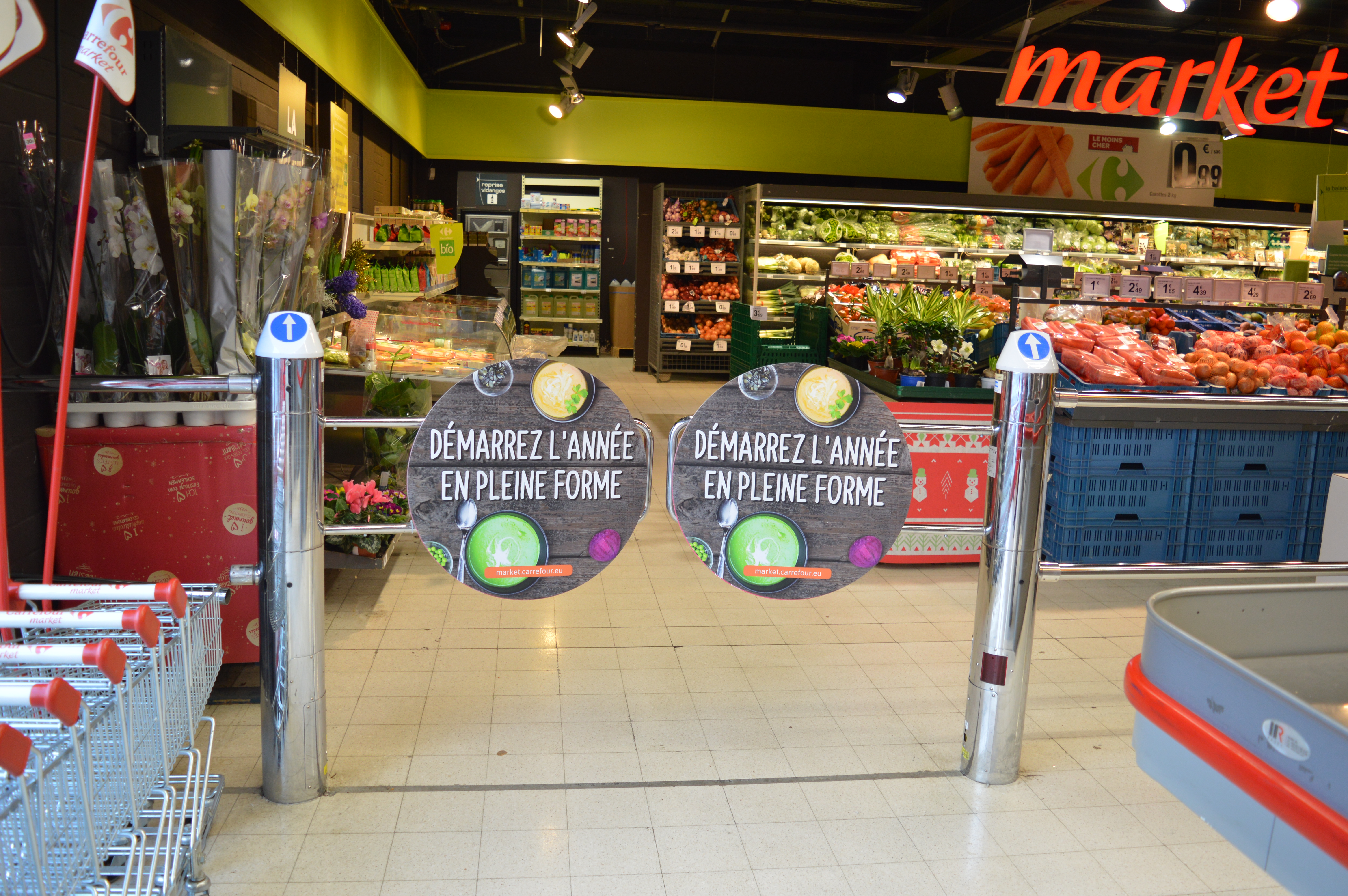 Nous proposons des campagnes de 2 ou 4 semaines sur jusqu’à 64 points de vente Carrefour, avec un total pouvant aller jusqu’à 492 portillons. Chaque entrée de magasin comprend entre un et quatre portillons, avec des panneaux placés sur la face avant de chaque portillon.